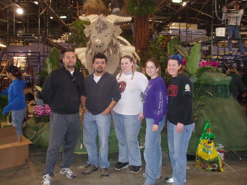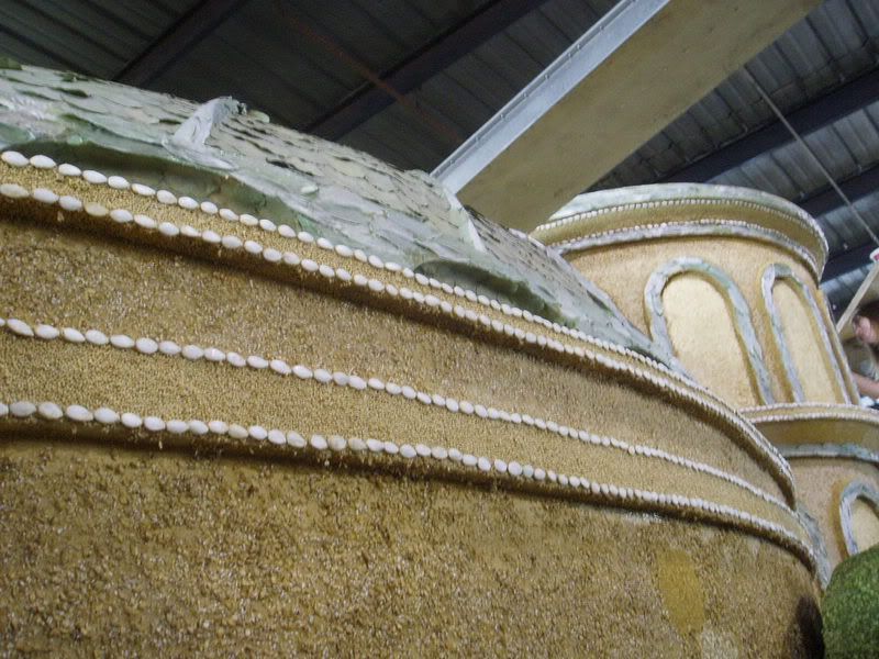 Five of us went up about 20 feet to glue pumpkin seeds on one of the Theed Palace domes (the top two rows here). Our "crew" was Rachel, myself, Diego from the SDSWS, Sterling the LFL Film Archivist, and Tracy, a local fan who heard about the decorating through the LA Fanforce boards. Aren't we pretty? We pretty much stuck together all day. Once the pumpkin seeds were finished, we moved on to pinning the greenery that wound around the balconies and covered the bottom of the Naboo float. It didn't involve any glue, but in trade we got the oh-so-charming tiny, sharp thorns that covered the stems of the sprigs. I'm pretty sure I have three still stuck in my thumb. It was a nice opportunity to be somewhat artistic, though, even if most of it did eventually get covered by flowers.