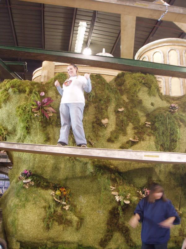 miana_dude, aka Rachel, who was coordinating all the SW float volunteers. We were gathered together by one of the float company employees, who asked us to divide into two groups, people who wanted to stay on the ground, and people who didn't mind going up on scaffolding. I said sure, why not, I'll go up in the sky. Be fun, right? Well, it was mostly fun, until you saw that the scaffolding was a foot wide and had no railings. Then it became about equally fun and scary. :)